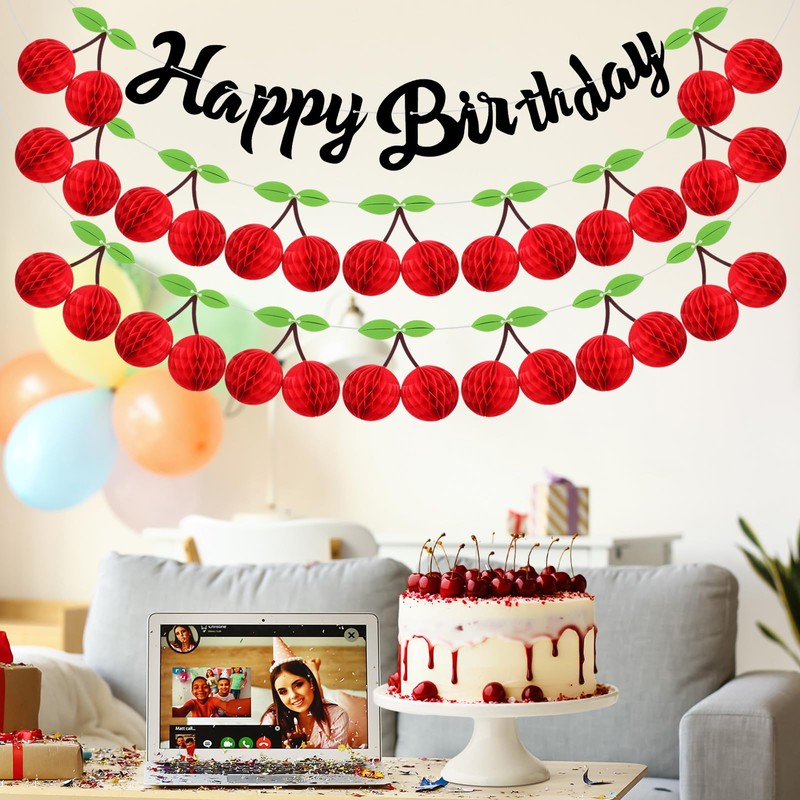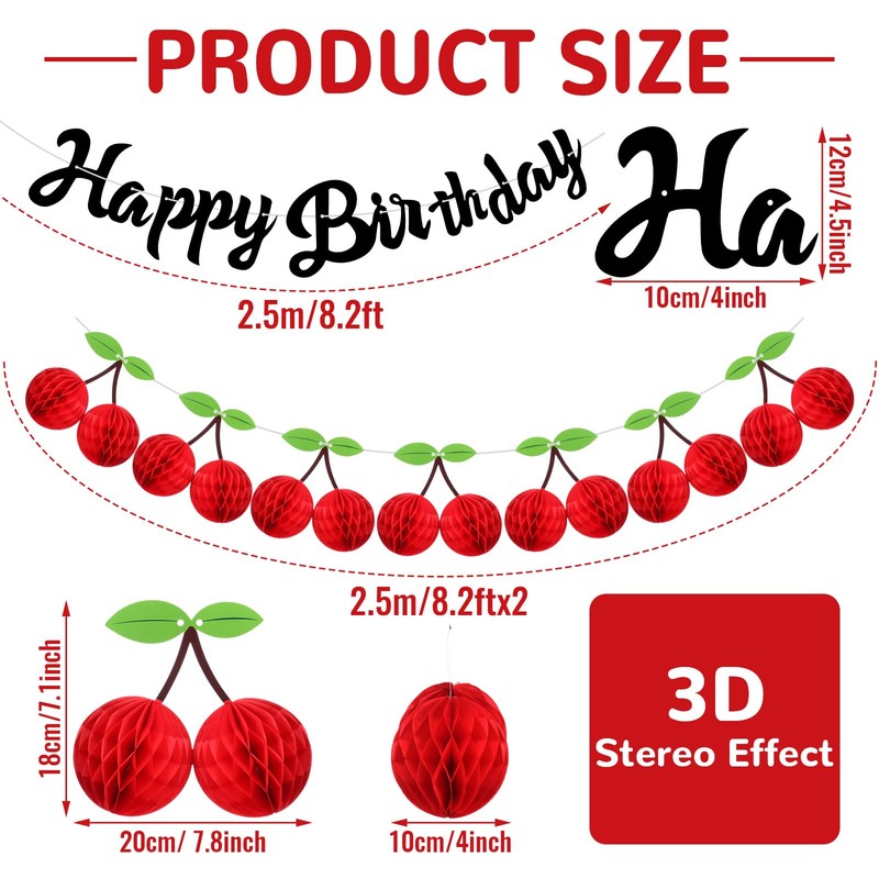 - Charming Cherry Design: Transform your celebration with our delightful cherry theme decorations; our unique cherry garland banner uses bright red, green and black colors, and stands out with its 3D honeycomb style; this novel design not only attracts people's attention, but also two red 3D paper folded cherries, adding a touch of playful vitality. It's super fun and cute just to think about it!