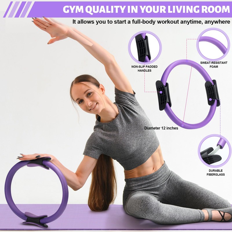 RoundFunny Set of 18 Pilates Ring Essential Kit for Women Pilates Ring and Ball Ankle Resistance Band Yoga Strap Socks Mat Arm Stretcher Latex Tube Gym Back Bag Exercise Equipment for Workout (Purple)