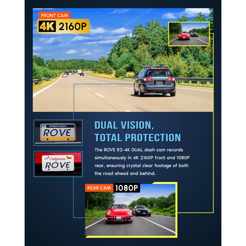 - 4K ULTRA HD + 1080P FRONT AND REAR DASH CAMERA – ROVE R2-4K DUAL dash cam offers dual-channel recording capabilities, capturing footage simultaneously from both the front and rear cameras. The front camera records at 3840x2160P @30fps, while the rear camera captures 1920x1080P @30fps footage, ensuring clear recordings of the road ahead and behind you. With a 150° ultra-wide angle for the front camera and a 140° angle for the rear camera, you'll capture more of the road with this 4k dash cam.