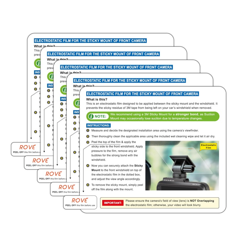 • What You Get: This package contains 5-pack of high-quality electrostatic films, designed for mounting the sticky mount of the primary camera for ROVE Dash Cams, including the R2, R2 PRO, and R2 DUAL models.
