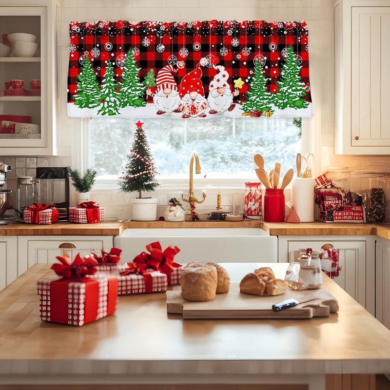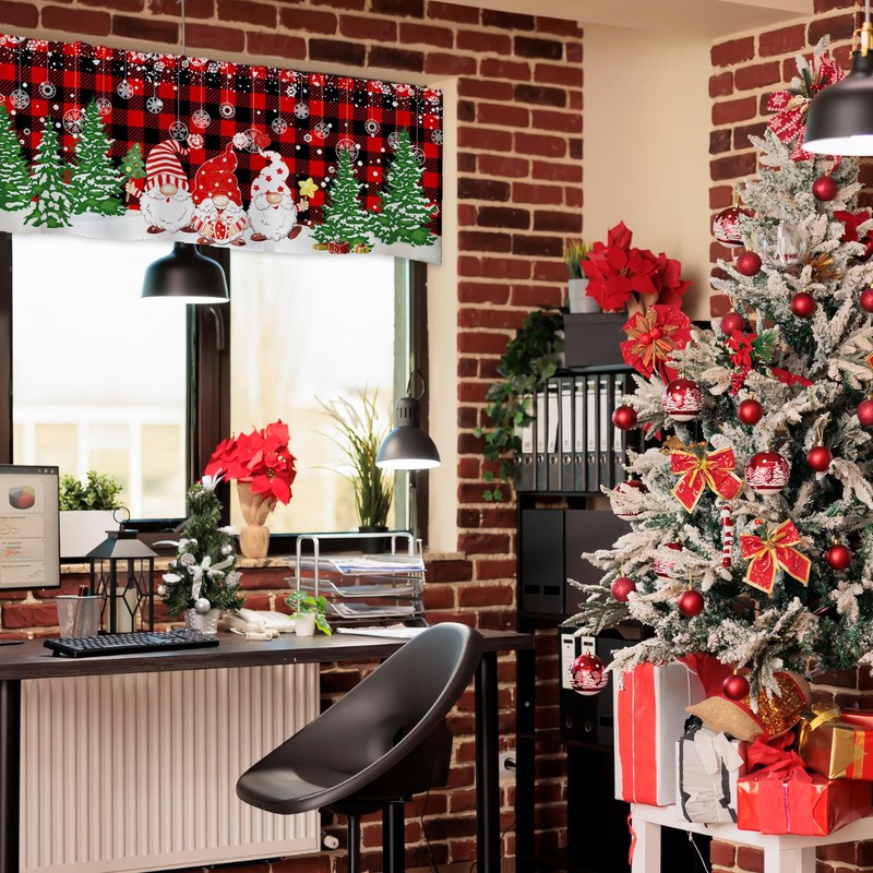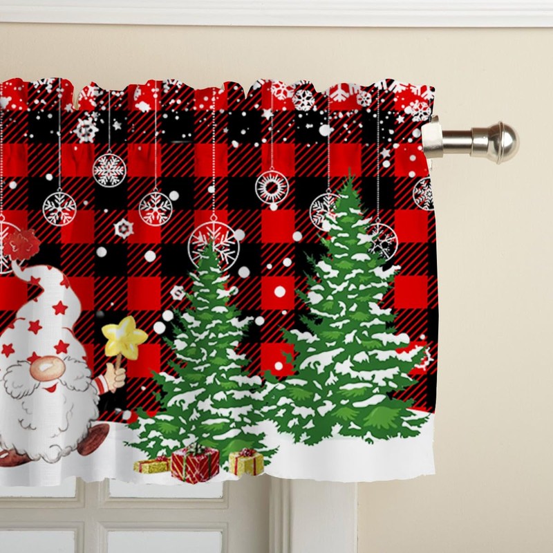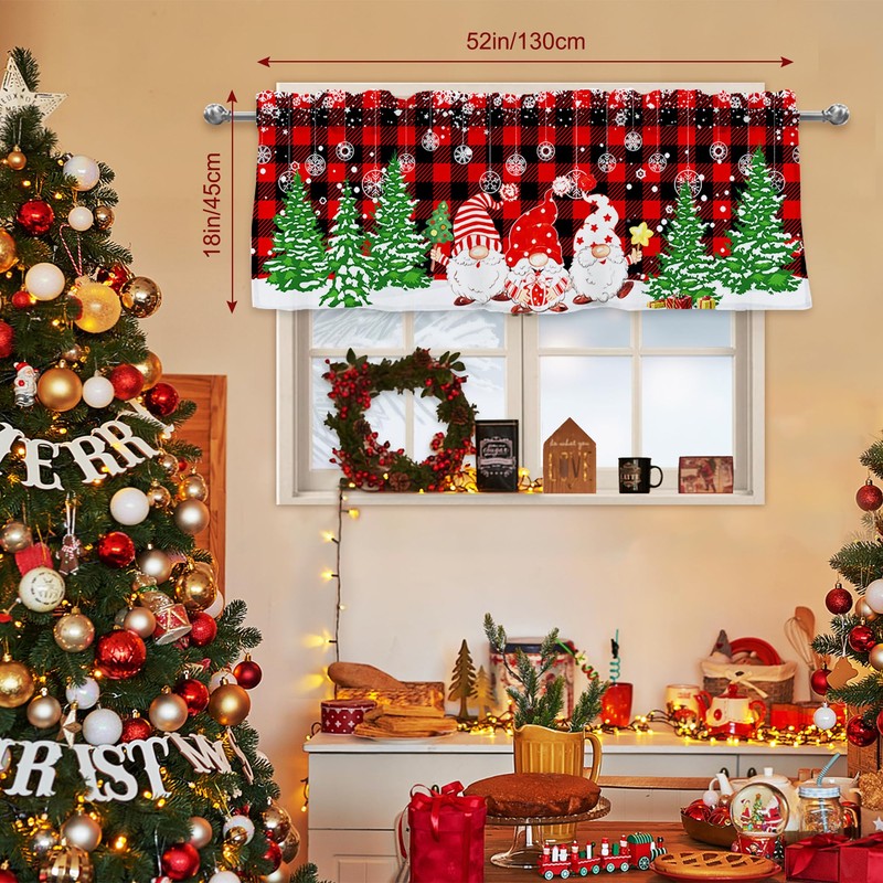 Rovozar Christmas Valance for Windows, Christmas Gnome Window Valances, Xmas Red Buffalo Plaid Window Curtain 1Panel 52 x 18 inch, Christmas Valance for Kitchen Bathroom Bedroom Decor