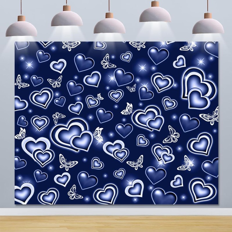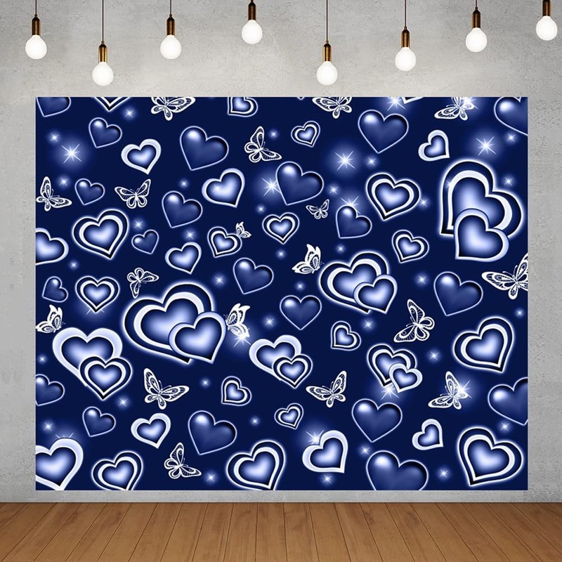 Royal Blue Early 2000s Heart Photo Backdrop 10x8ft Glitter Love Heart Butterfly Early 2000s Party Decorations Old School Backdrops Valentine's Day Background Happy Birthday Banner