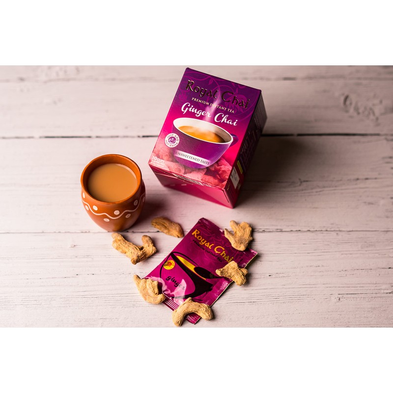 - SIZE OF ROYAL CHAI PREMIUM GINGER INSTANT INDIAN TEA (Unsweetened) now available in a BOX for 10 cups. This is a single box of Royal Chai. Each box comes with 10 single serving sachets. Format - Instant Powder.