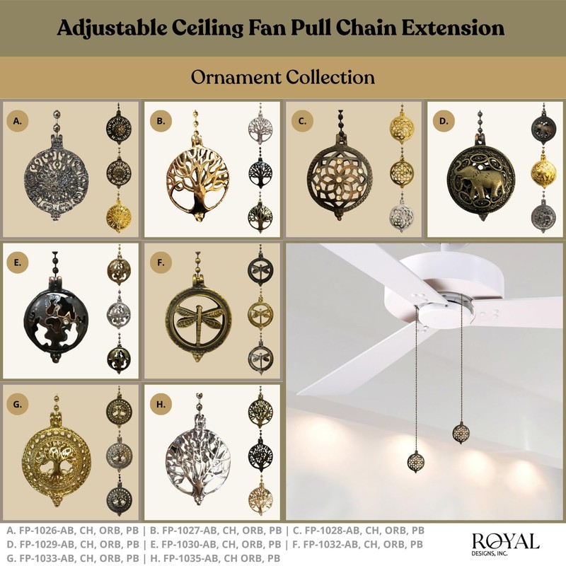 The Royal Designs decorative fan pull chain is a simple and effective way to add style and flair to your home décor! The adjustable 24-inch chain makes it easy to extend comfortably from nearly any ceiling height, and the high-quality metal Ornament, 24 Inch is both beautiful and functional. We have designs ranging from exquisitely traditional to whimsically modern, so you’re sure to find a pull chain that’s perfect for you. We also offer four unique and exciting finishes! The bright and shimmering Polished Brass and Chrome finishes catch the light spectacularly, while the Antique Brass and Oil Rubbed Bronze finishes will lend a timeless and mature look to your fixture. Our pull chains are also fantastic for lamps with pull chain switches! The standard chain gives you the flexibility to choose how you’ll use it. Grab two distinctOrnament, 24 Inchs to easily tell the difference between the light and the fan!