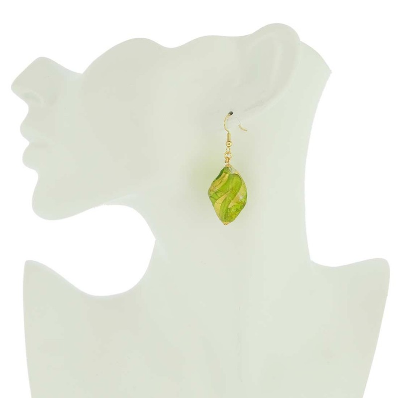 These stunning earrings, in a gorgeous emerald and gold colour palette, each feature a unique twisted bead suspended from a strand of small round beads. The amazing colours and exquisite design together create a subtle golden shine as the light penetrates through the glass. The timeless beauty of these earrings is a testament to the unparalleled ability of Murano glass makers to create magic from glass. This versatile piece of jewellery can be worn with your favourite sweater, shirt or evening dress and is guaranteed to bring you many compliments. Wear it to demonstrate your distinctive sense of style and taste. Add the matching necklace to create an even more impressive look.