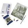 - Includes 1 grayscale pre-printed artist board, twelve 5 ml. acrylic paints, 1 plastic palette, 1 flat brush, 1 round brush, and color instruction booklet