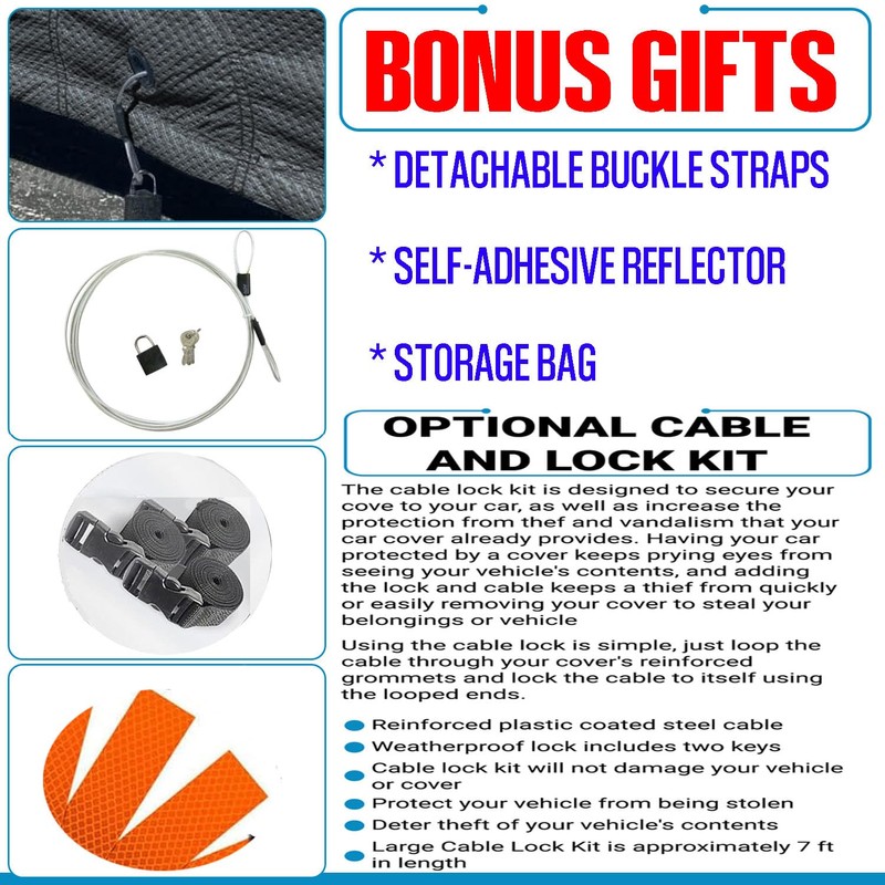 - Free Storage Bag and Cable and Lock Kit: The cable lock kit is designed to secure your cover to your car.