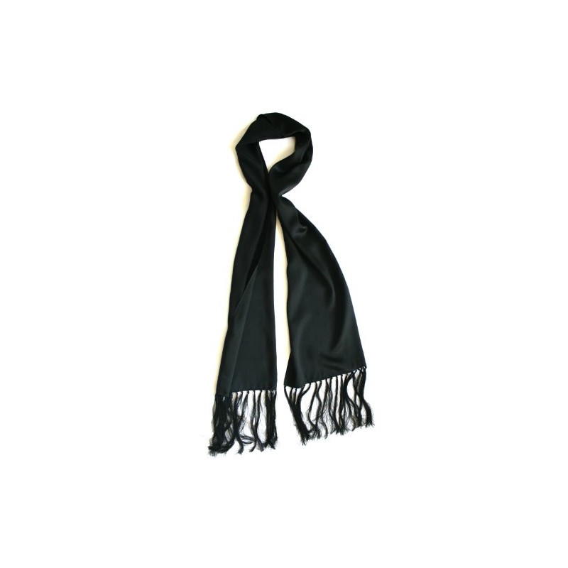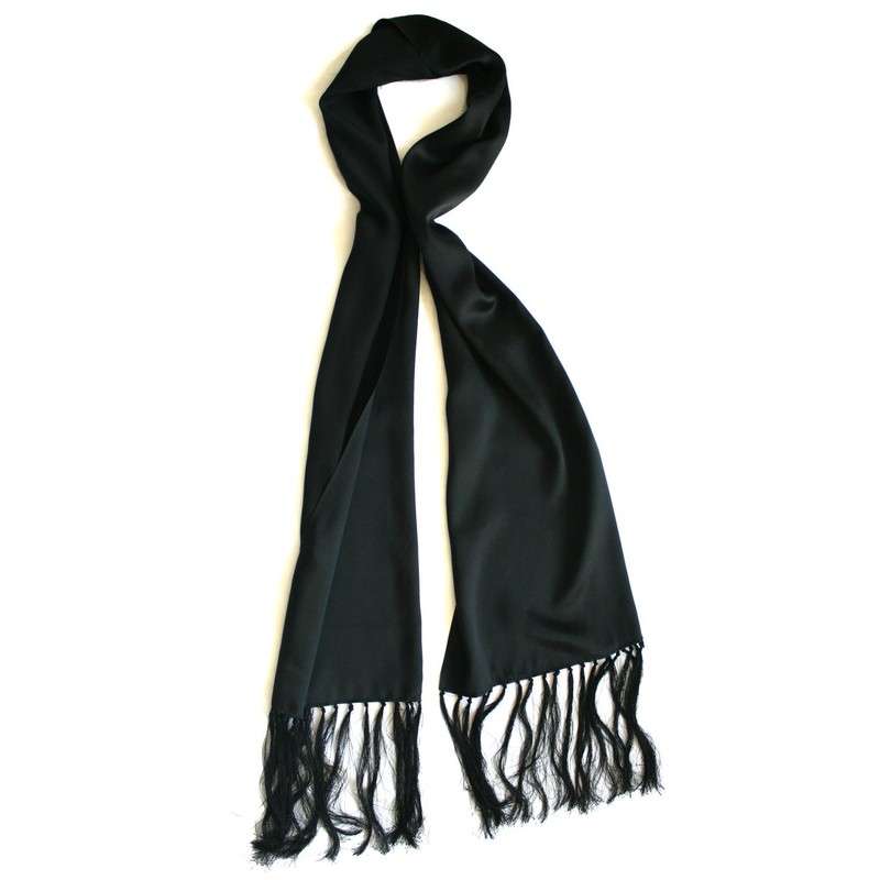 Royal Silk Long Black Fringed Satin Silk Scarf 14” x 75” – 100% Silk