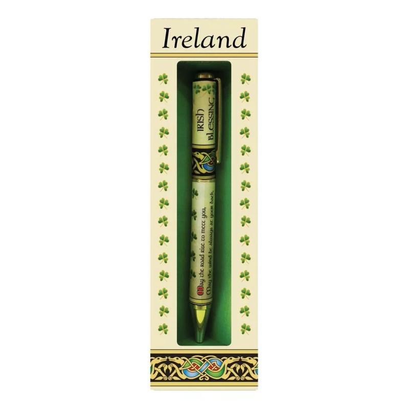 Whether you wish to elevate your office or immerse yourself into the wonderful world of journaling and self-expression, choose our Irish Blessing Ballpoint Pen! This pen features a ballpoint tip that will run smoothly on any type of paper while the sleek design ensures you can comfortably hold it. The elegant black ink is sure to last and make your writing experience much more lovely. The design showcases the traditional “May the road rise to meet you” Irish blessing, a common expression of success and protection on your journey in life. Additionally, the shamrocks are a representation of the Holy Trinity in Irish Christianity, as well as love, faith, and hope. The pen measures 5.39 inches in height and 0.47 inches in width, ideally sized to fit on your desk, inside your drawers, or even in your bags if you wish to write down your thoughts while on the go. Our Irish blessing pen makes a wonderful gift for those you hold dear or for anyone who enjoys self-expressing through writing down memoirs!