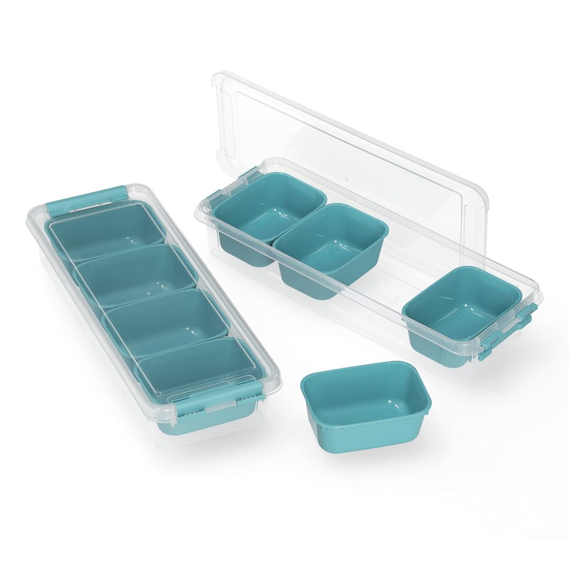 - Practical design: each snack container has a separate lid and 4 removable inserts. Each insert has a volume of 300 ml. Due to the compact dimensions of only 14 x 36.5 x 6.2 cm, the snack bowl can also be stored in a standard fridge.