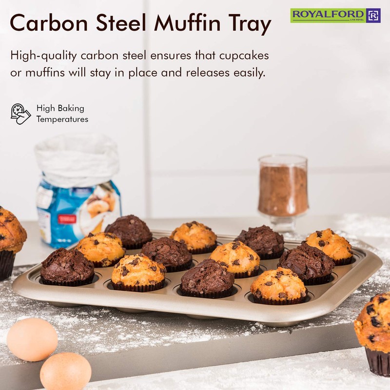 Royalford Premium Non-Stick Muffin Tray, 12 Cup – Cupcake Tray/Baking Pan – Aluminium Build, Non-Stick Mince Pie/Cupcake Tin – Ideal for Cupcakes Muffin Pie Yorkshire Pudding Baking - 0.5mm Thick
