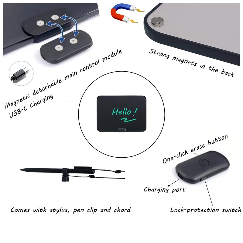 - 【Ideal Gift】Package includes: LCD writing pad, stylus, pen clip, chord and USB-C cable. A perfect gift choice for kids and adults. Back to School Note Board