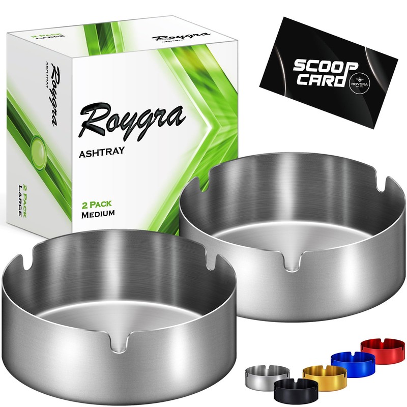 roygra roygra Ashtray 2 Pack, Stainless Steel Ash Tray for Indoor or Outdoor Use, Unbreakable Tabletop Ash Holder for Home Outside Office Patio Balcony - Silver, Medium