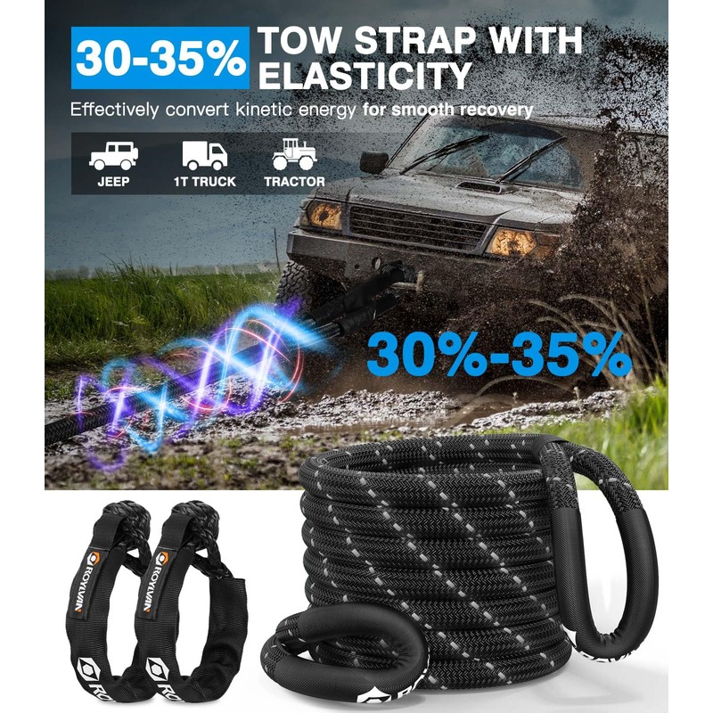 - Efficient and Secure: The tow strap can extend from 30% to 35% during a rescue. It has high resilience to ensure smooth and effective transfer of kinetic energy. Whether your vehicle is stuck in mud, sand, snow or on a steep road, it can be pulled out easily for an efficient and safe recovery.
