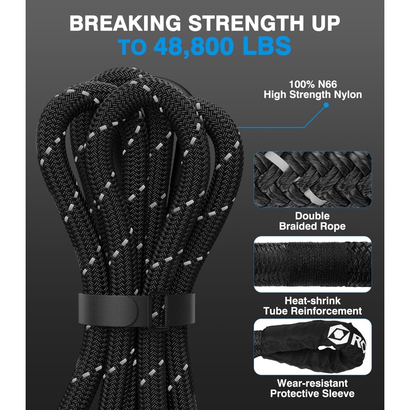 - 48800 LBS High Strength: The kinetic recovery rope is made of high-quality N66 nylon with double braided process for added sturdiness. With a laboratory-tested breaking strength of up to 48,800 LBS, it can effectively recover a wide range of vehicles including jeeps, SUVs, ATVs, trucks, making it an indispensable tool for vehicular adventures.