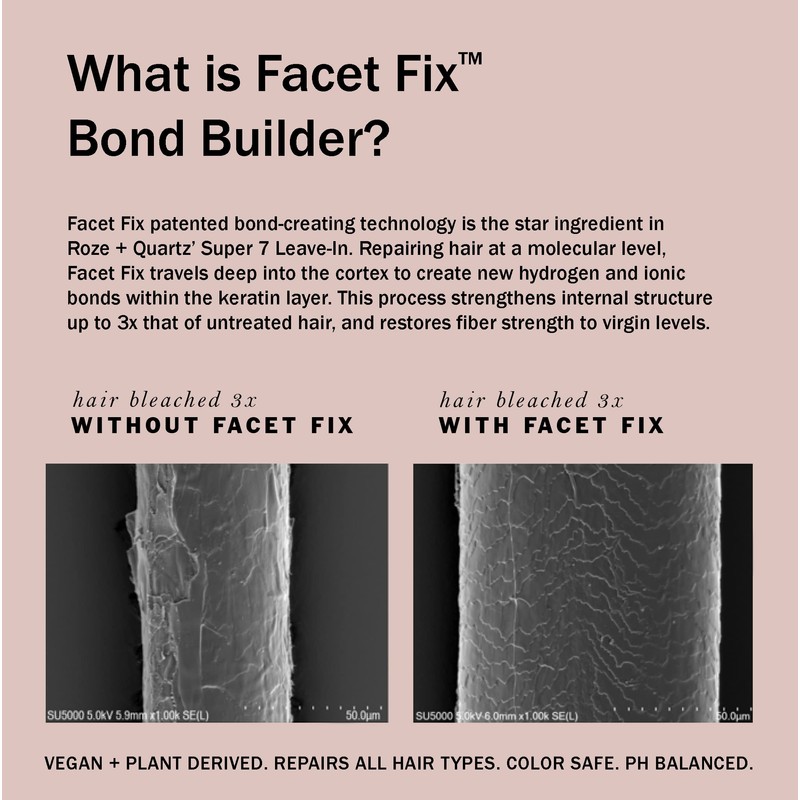 The Roze + Quartz Super 7's Facet Fix Bond Builder repairs hair at a molecular level, strengthening internal hair structure up to 3x that of untreated hair. Facet Fix technology creates additional hydrogen and ionic bonds within the hair’s keratin structure and penetrates deep into the cortex. This strengthens each hair fiber to levels of virgin hair.