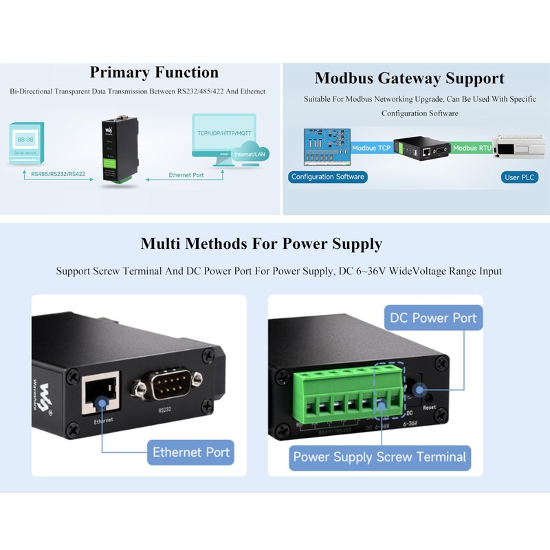 - Multi Power Supply Methods---Support Screw Terminal and DC Power Port for Power Supply, DC 6~36V ide Voltage Range Input. Modbus Gateway Support---Suitable for Modbus networking upgrade, Can Be Used With specific Configuration Software. Multi Configuration Methods---Supports Web browser configuration, obtaining dynamic IP via DHCP, DNS protocol connected domain server address.