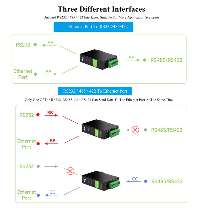 - Ethernet Port To RS232/485/422---The Ethernet port can send data to three serial ports at the same time. RS232 / 485 / 422 To Ethernet Port---Only one of the RS232, RS485, and RS422 can send data to the Ethernet port at the same time.