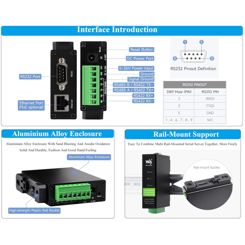 - Rail-mount support---Easy to combine multi rail-mounted serial server together, more freely. Aluminium Alloy Enclosure---With Sand Blasting And Anodic Oxidation, Solid And Durable, Fashion And Good Hand Feeling.