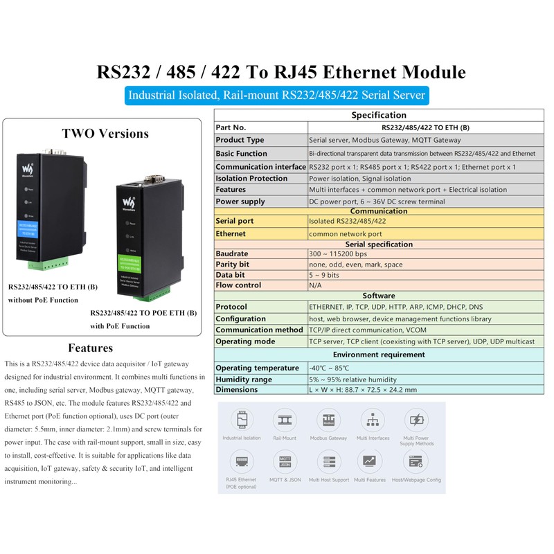 - This is an Industrial Isolated, Rail-mount RS232/485/422 Serial Server device data acquisitor / IoT gateway designed for industrial environment (Aluminium Alloy Enclosure). It combines multi functions in one, including serial server, Modbus gateway, MQTT gateway, RS485 to JSON, etc. Suitable for data acquisition, IoT gateway, safety & security IoT, and intelligent instrument monitoring, etc.