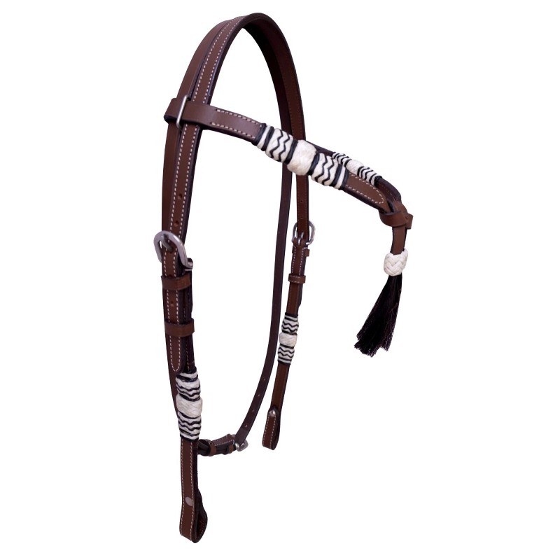 - Top Brand and Quality products at rock bottom prices. Western Bitless Headstall / Bridle. Horse Size. This is an excellent quality high end product, picture tell for itself. New and never used Rawhide Accents and Horse Hair cheek and brow band. Headstalls with wide teardrop cheek design. Measurements: Headstall Adjusts on both sides from 37 inches to 46 inches. But with most headstalls it can be taken up indefinitely and lengthened another 4 inches by adding holes. The cheek pieces at their widest point are 2 inches and the bit attaches by Chicago screws. The brow band measures 15 1/2" long and is1" at its widest point. Stainless Steel fitting LEATHER: High Quality Thick Genuine Bridle Leather COLOR: BLACK HARDWARE: Solid Stainless Steel Buckle With Sparkling Finish SIZE: Standard Size This is a unique combination of gorgeous headstall constructed of High quality thick 100% leather, carefully hand-made with all the required precision to give the most unique look on an arena or a trail. The edges are all hand-dyed and the hardware used is solid Stainless Steel with excellent sparkling finish. They are ideal for a standard size horse and have some room for adjustments.