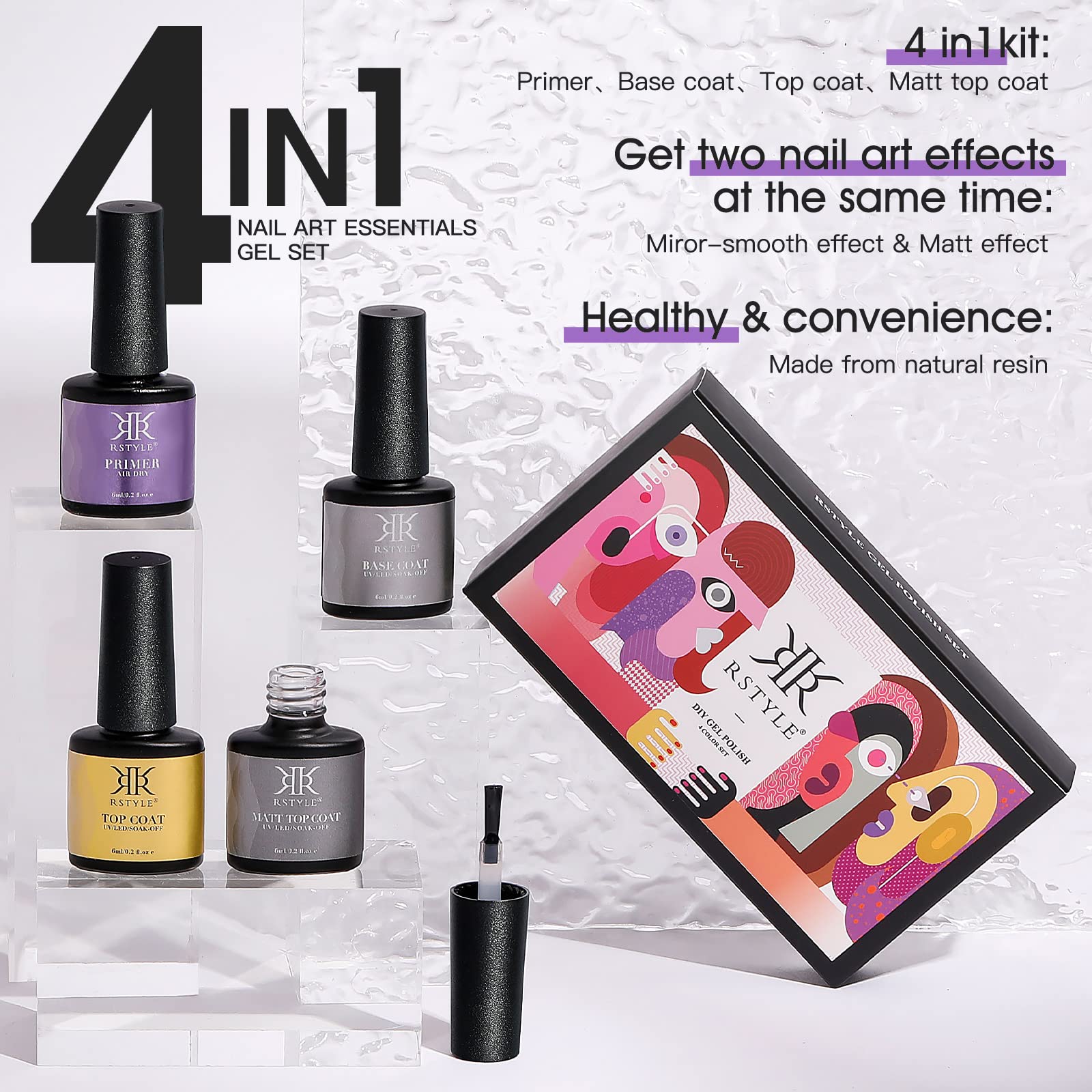 RSTYLE Semi-Permanent Base and Top Coat, Semi-Permanent Matte Nail Polish Top Coat Primer Soak Off UV LED Manicure Kit Nail Gel Polish (4*6ml)