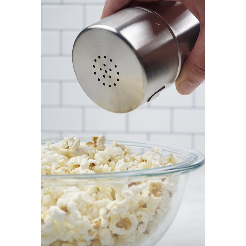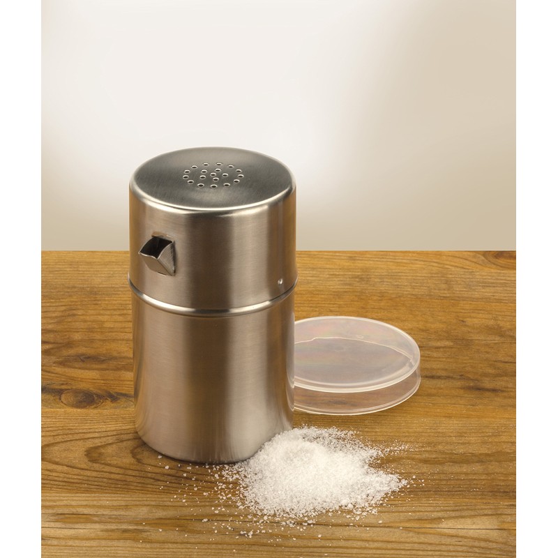 - Features both conventional holes on top for fine granules and a convenient pour spout on the side for more course salts