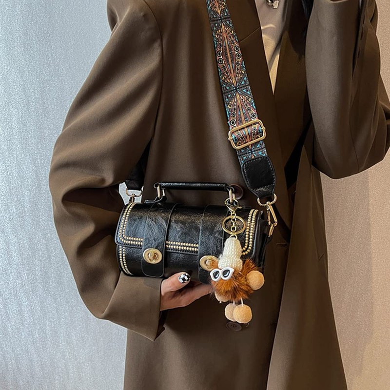 RTGGSEL Retro Vegan Leather Crossbody Shoulder Duffel Barrel Bags for Women Small Tote Satchel Handbags Purse (Black)