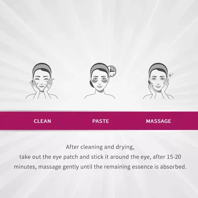 After cleaning and drying, take out the eye patch and stick it around the eye, after 15-20 minutes, massage gently until the remaining essence is absorbed.