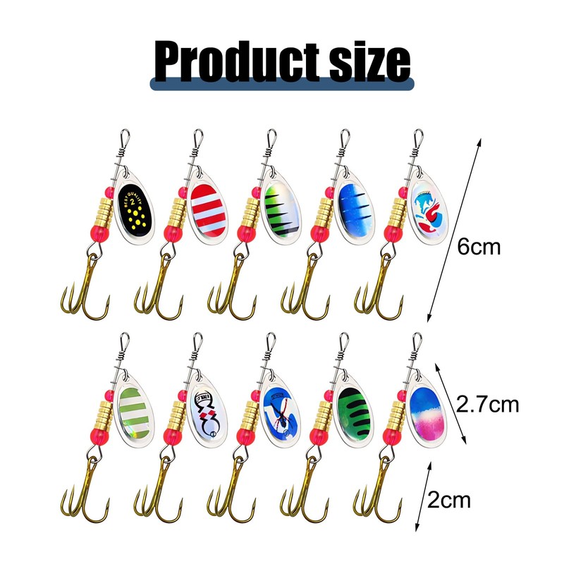 - Extensive set: bait set contains 10 spinner baits and a practical carry bag. Ideal for outdoor fishing trips, it provides comfort and safety when fishing. Perfect for anglers looking for a versatile selection of fishing accessories to catch different types of fish.