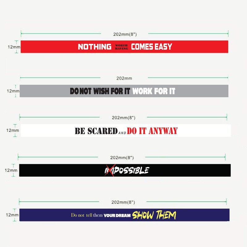 - 5 INSPIRATIONAL QUOTES: You will find five memorable motivational quotes within each 12 pack of rubber wristbands. Mix and match your favourite messages to suit your needs.