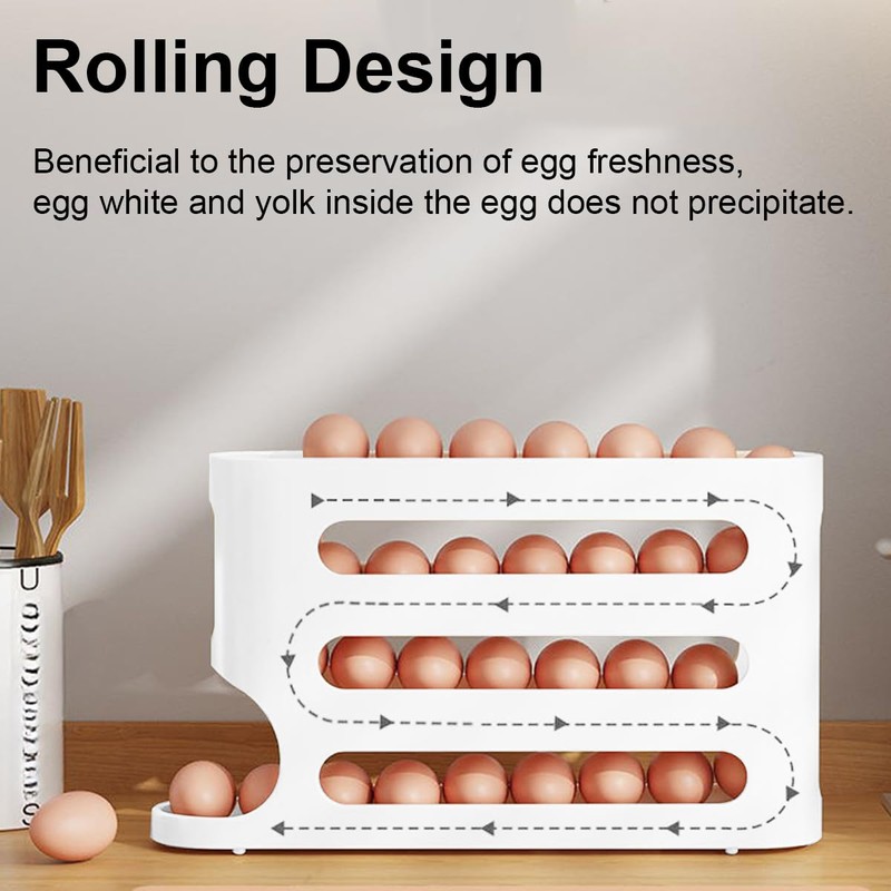 - Automatic dispensing design: the four rails inside the egg rack are connected to each other and are provided with a gentle slope to prevent damage to the eggs or separation of egg yolk and egg white. Simply place the eggs on the top shelf and the eggs roll securely onto the bottom shelf of the egg rack.