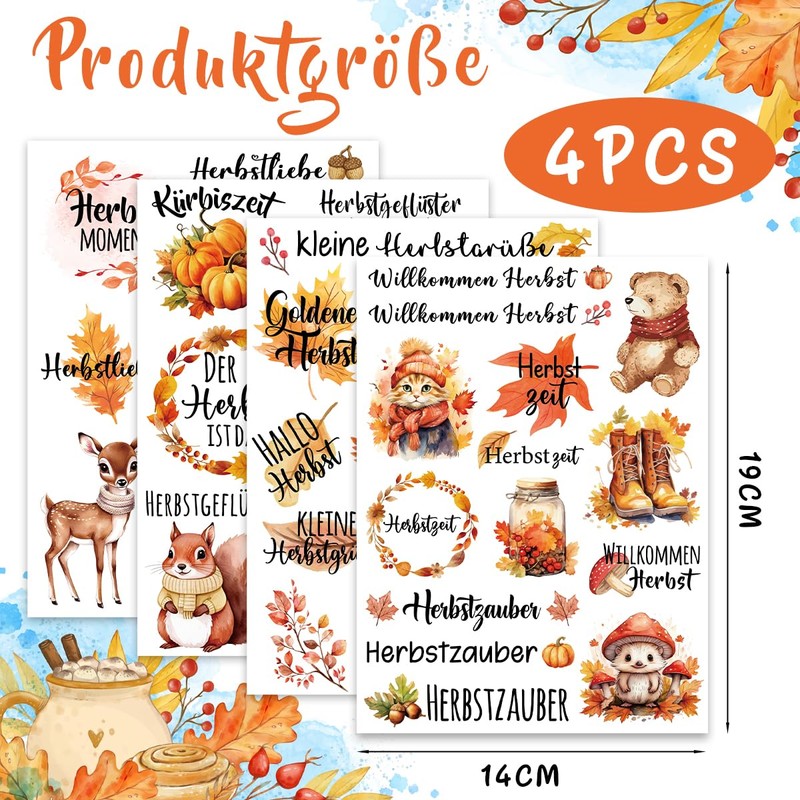 - 🦔 Lieferumfang: 4 Blätter Rub Ons Sticker mit reichen Herbst Mustern und Sprüchen, eleganten Schriftarten und klarem Druck können ihre unterschiedlichen künstlerischen Dekorationsbedürfnisse erfüllen. Größe:19 x 14cm.
