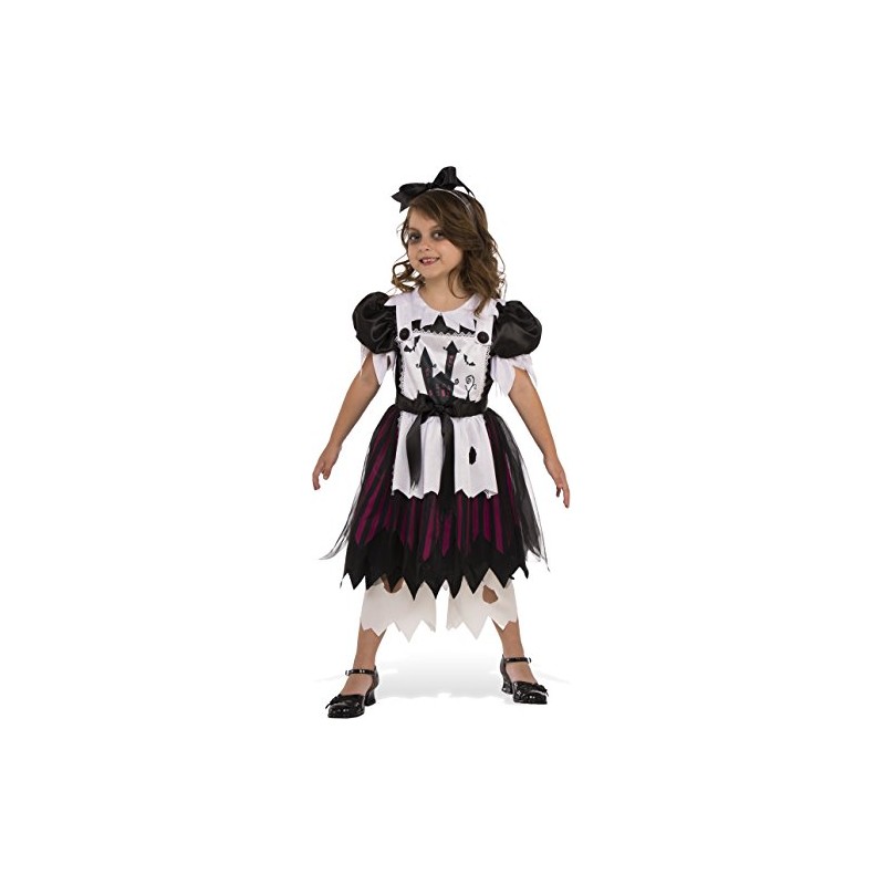 - Girl's little broken doll costume; spooky dress, pantaloons, and headpiece