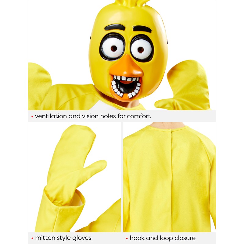 - COMPONENTS: Chica costume jumpsuit, half-mask, and gloves
