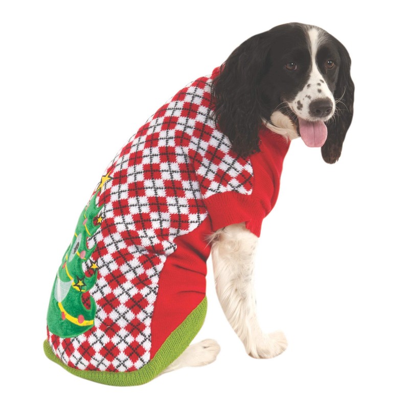Red and white argyle sweater with a comical Christmas tree appliqué. IMPORTANT! NOT ALL COSTUMES WILL FIT ALL PETS, consider costume style and animal size; READ THE RUBIE’S PET SIZE CHART and WATCH THE SIZING INSTRUCTION VIDEO, do not select size based on breed. Family-owned, family-focused, and based in the U.S.A. since 1950, Rubie’s is the world’s largest designer and manufacturer of costumes – of course they’d remember your four-legged best friend!