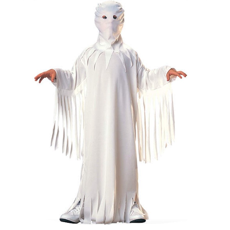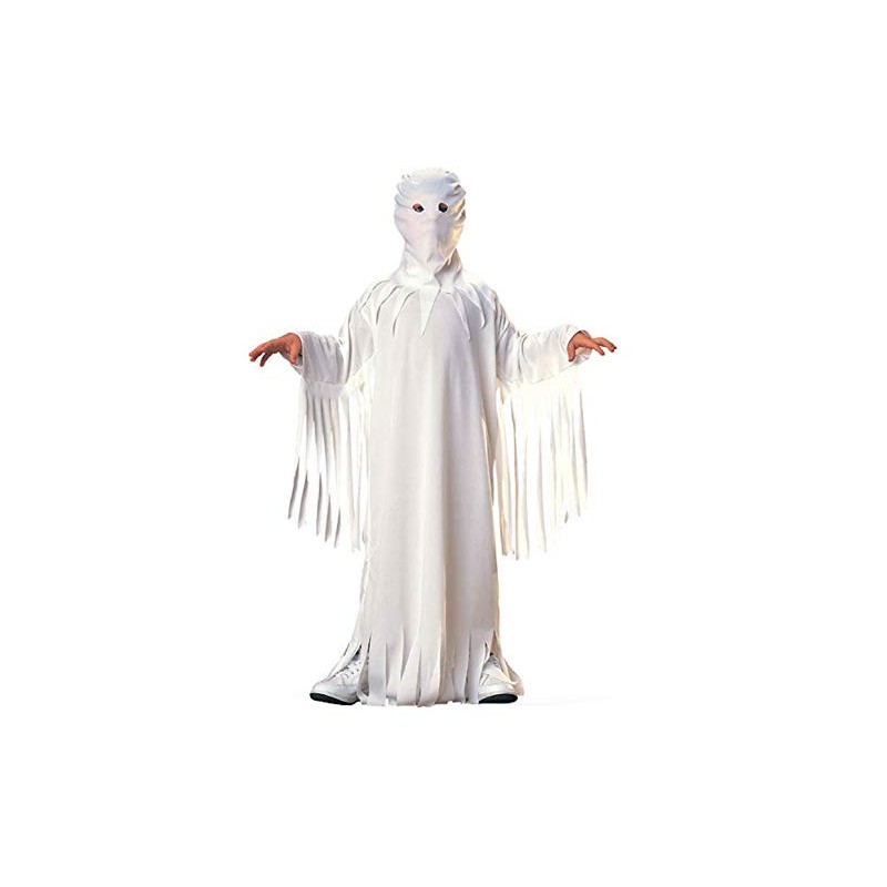 - Child's spooky ghost costume has white robe and hood
