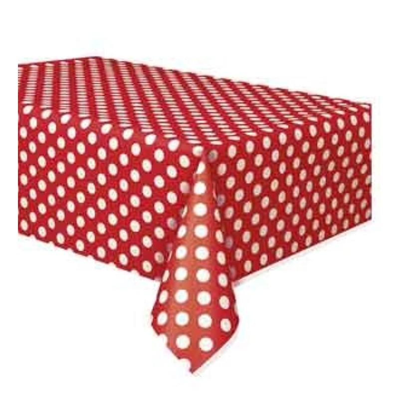 - Plastic tablecover with polka dot design.