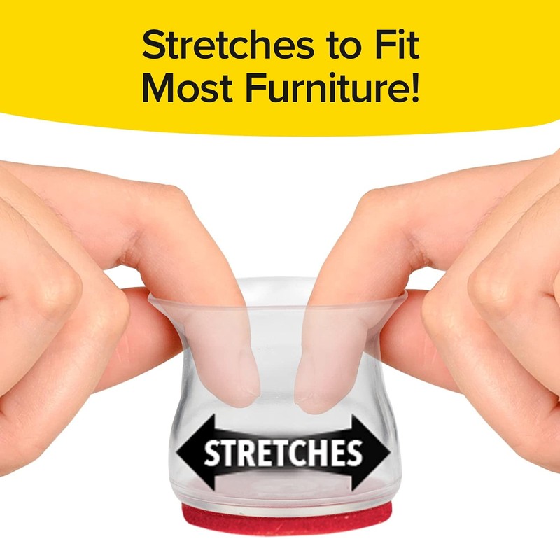 • Floor Protectors Stretch to Fit: Ruby Sliders clear chair leg floor protectors easily stretch to fit over furniture legs without adhesive pads or glues; just slip these chair and table leg pads on your furniture legs and they’ll fit snuggly to stay in place