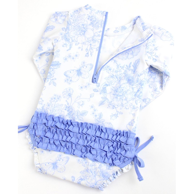 RuffleButts Baby Girls UPF 50+ Sun Protection Floral Printed Long Sleeve One Piece Rash Guard Swimsuit with Zipper - Periwinkle Butterfly Garden, 12-18m