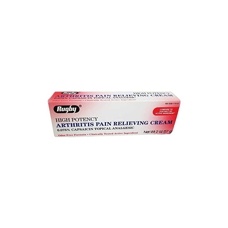 Rugby High Potency Arthritis Pain Relieving Cream, 2 oz Each (Pack of 6) - This maximum strength cream uses the natural power and heat of the chili pepper to relieve even your toughest muscle and joint pains. It works by blocking your body's pain messenger, Substance P. Found in nerve cells, Substance P is responsible for transmitting pain signals to your brain. This cream by Rugby Labs blocks it, and the pain. This maximum strength cream uses the natural power and heat of the chili pepper to relieve even your toughest muscle and joint pains. It works by blocking your body's pain messenger, Substance P is responsible for transmitting pain signals to your brain. This cream by Rugby Labs blocks it, and the pain. Arthritis creams help relieve joint pain when applied to the skin. They can provide short-term but effective relief. These creams tend to work best on joints that are close to the surface of the skin, such as the joints in the hands or knees. Mitting pain signals to your brain. This cream by Rugby Labs blocks it, and the pain. Directions: Adults and children 18 years of age and older: Apply a thin film of cream to the affected area and gently rub in until fully absorbed. Unless treating hands, wash hands thoroughly with soap and water immediately after application. For best results, apply 3 to 4 times daily. Children under 18 years: ask a doctor. Other information: Store at room temperature 15 - 30C (59F C 86F).