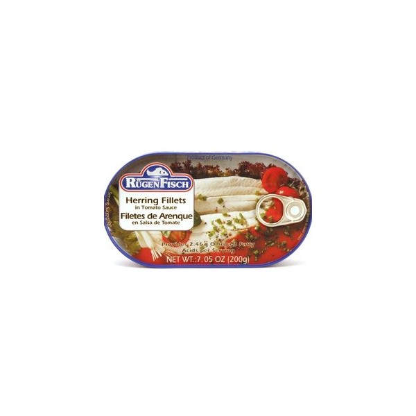 RugenFisch Herring Fillets in Tomato Sauce in 7.05oz tin. Filetes de Arenque en Salsa de Tomate. RugenFisch Herring Fillets tomato sauce consists of carefully chosen herring fillets dipped in rich and tasty tomato sauce. Tender and mild herring fillets in tomato sauce will bring you exquisite taste of nature and a healthy meal with every bite you take. Herring has a strong flavor and considered a very rich oily fish and high in omega-3 fatty acid. Rugen Fisch Herring Fillet provides 2.46g Omega-3 Fatty Acids per serving. Product of Germany.