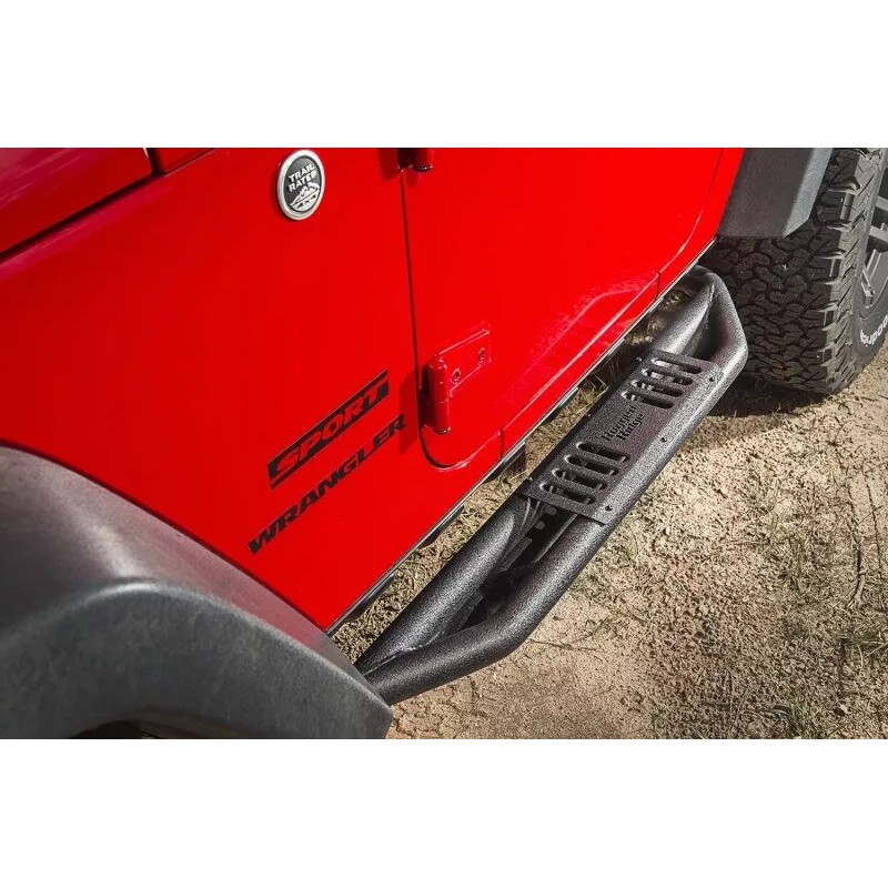 RRC Side Armor Step Plates are the perfect addition for your RRC Side Armor (11504.21). Constructed of tough stamped steel with a sturdy black textured powder coat finish; the Side Armor Step Plates give a solid platform to assist with vehicle entry that looks great and are engineered to last. With stylish recessed vents and the cutout Rugged Ridge logo; these step plates are as good looking as they are functional. Sold as a set of 2.