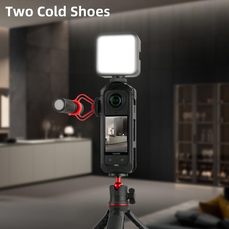 - Dual Cold Shoe Mounts:This Insta360 X5 cage features dual cold shoe mounts,enabling simultaneous use of microphones and lighting equipment to elevate your audio and visual production quality.