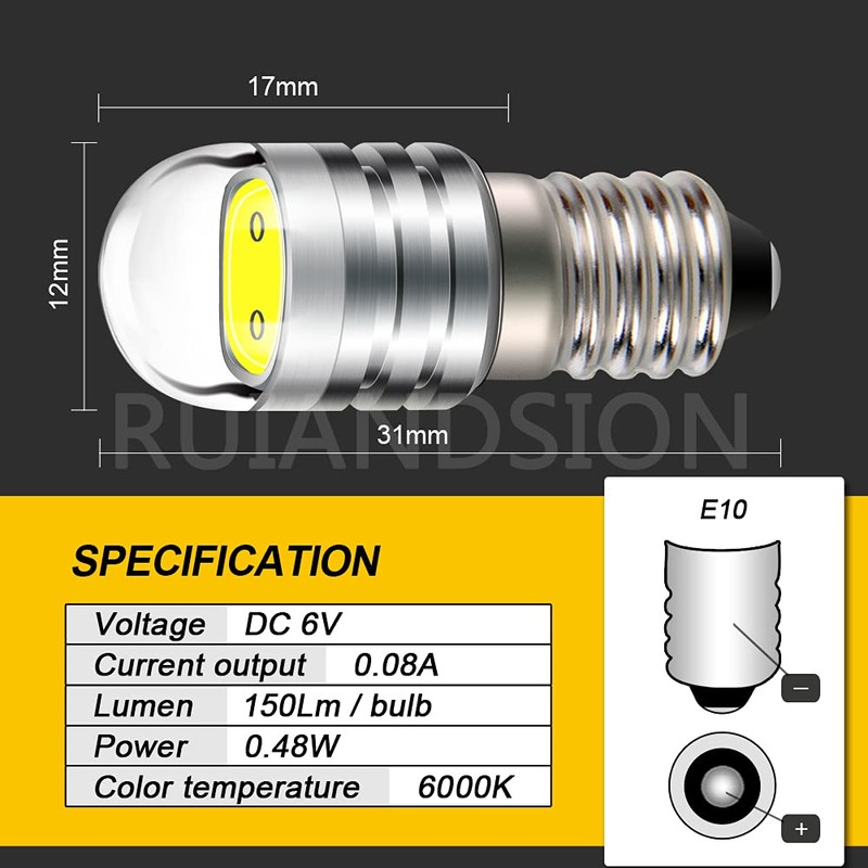 - 1.Model:E10,Voltage:6V,LED Color:White 6500K,Lumen:150LM,Current :About 0.1A,6V DC