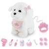 - This comes in a beautiful large gift box with a dog and all accessories that includes a remote control leash, mirror, comb, perfume bottle, hair dryer, bone, baby bottle and four foot covers. So this toy can teach your toddlers how to take care of a puppy before you take the jump to actually get one. It takes 3 AA batteries (not included)