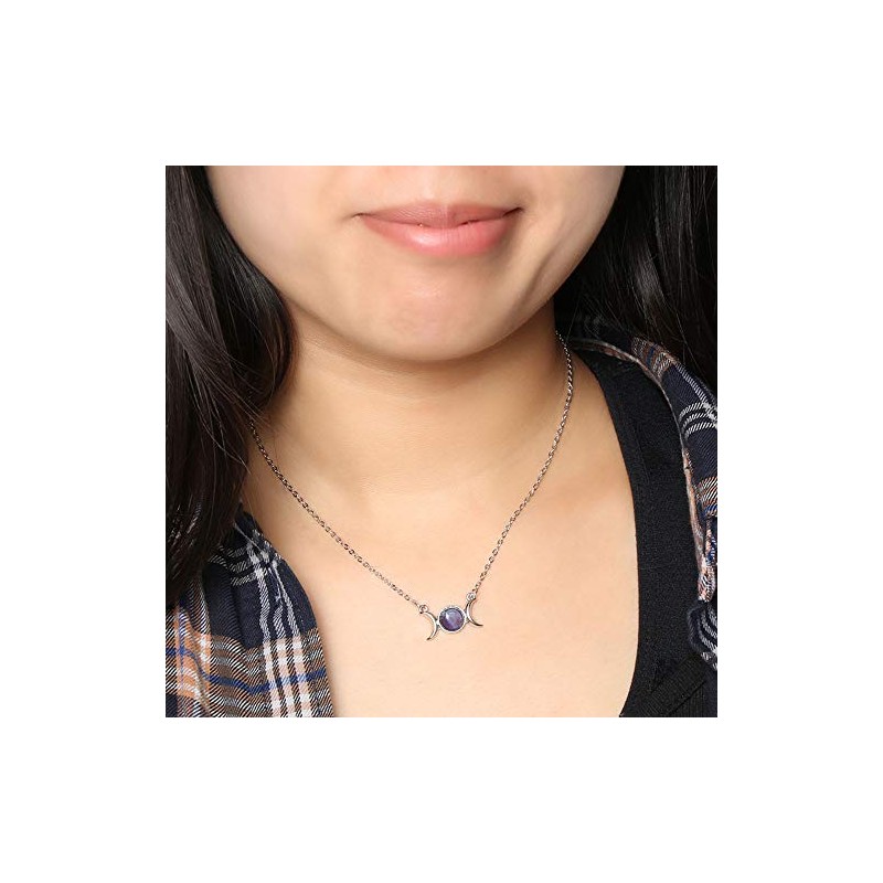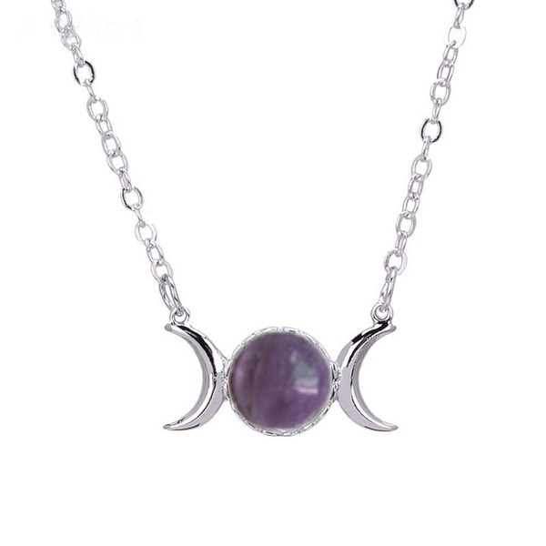 RUIZHEN Silver Triple Moon Goddess Symbol Opal Healing Crystal Natural Stone Pendant Necklace (amethyst)