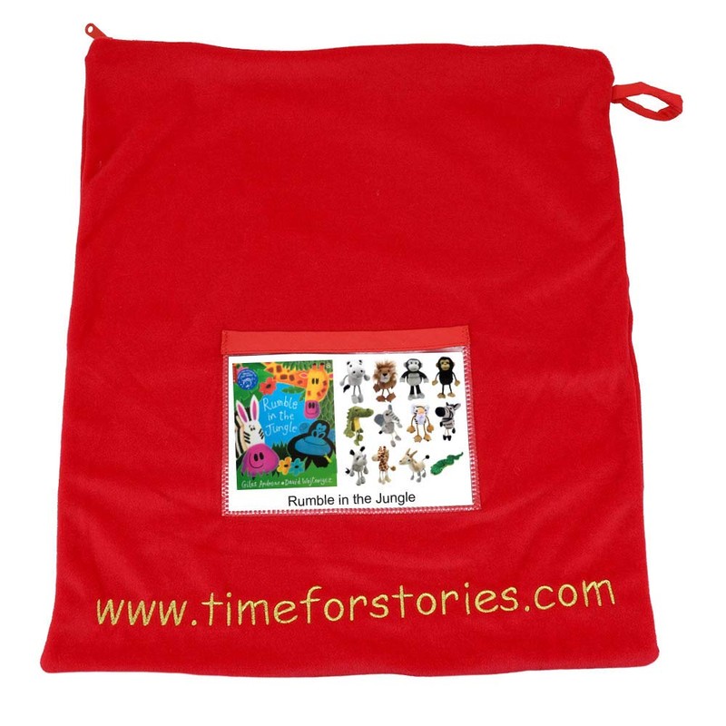 A Charming Story book with accompanying Puppets for the key characters - Chimp, Giraffe, Zebra, Antelope, Lion, Tiger, Rhino, Snake, Elephant, Crocodile, Gorilla & Hippo. Please note, Leopard finger puppet not included.
