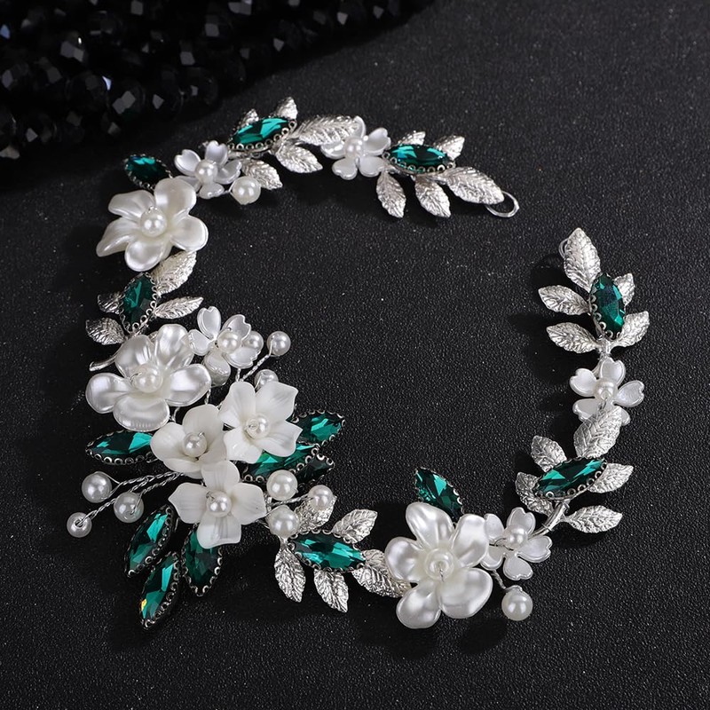Rumtock White Flower Silver Leaves Green Rhinestone Headband for Wedding Brides Bridesmaid Handmade Women Hair Accessories (Green)