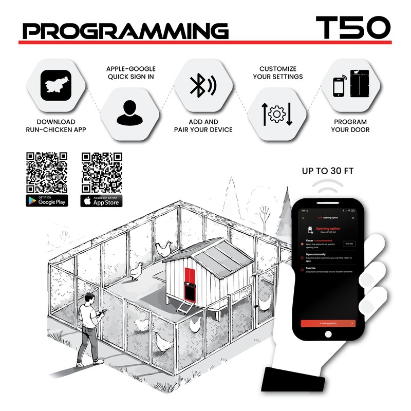 - Easily Programmable - Configure with push of a button or use phone app for more advanced. Chicken door automatically opens in the morning and closes in the evening. No more waking up early in the morning. You can set the Timer, Light Sensor, GPS mode or Manually configure to your needs.